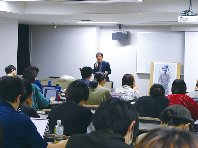 本学の造形領域におけるファインアート・デザインは多岐にわたり普遍的な造形理論と新たな表現方法を模索し続けています。この授業は他学科の専任教員をオムニバス形式で招き、各専門領域における現在と未来について講義します。各分野に特化した造形表現の中にも横断的で普遍的な共通要素を発見し表現行為の本質を探求することを目標としたラスボス的な4年生の必修講義科目で、造形領域を卒業前にあらためて問い直す機会となる授業です。