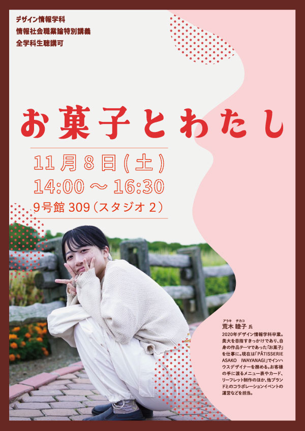 11月8日(土)14:00より「情報社会職業論」にて、学科卒業生 荒木 睦子 氏の特別講義を開催します。