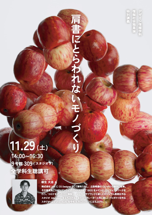 11月29日(土)14:00より「情報社会職業論」にて、アートディレクター 柳生 大志 氏の特別講義を開催します。